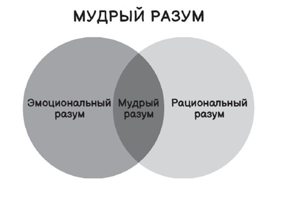 Вот простой пример. Представьте, что выбираете новую машину. Вы идете в салон и влюбляетесь в кабриолет вишневого цвета. Он будто зовет вас. Так проявляется эмоциональный разум, игнорируя высокую цену и неудобство такого средства передвижения для семьи. Рациональный разум обращает ваше внимание на более практичный вариант: подходящий по стоимости, работоспособный седан, в котором тщательно продумана система безопасности. Однако он не вызывает восхищения. Если позволить эмоциональному разуму принимать решение, вы поедете домой в кабриолете, который не вместит семью из четырех человек. Если же выбор будет за рациональным разумом, вам достанется скучный автомобиль, не вызывающий восторга. Мудрый разум поможет найти машину, которая удовлетворит обе стороны — найдет компромисс. Может быть, это будет безопасное авто приятного цвета с крутыми техническими характеристиками, у него будет панорамный люк, который позволит безопасно разместить семью, но немного напоминает кабриолет. Мудрый разум — это точка пересечения между тем, что вы чувствуете, и тем, что знаете. Осознание того, какая сторона разума сейчас доминирует, помогает понять, в том ли направлении мы двигаемся; так нам легче установить связь с мудрым разумом.
