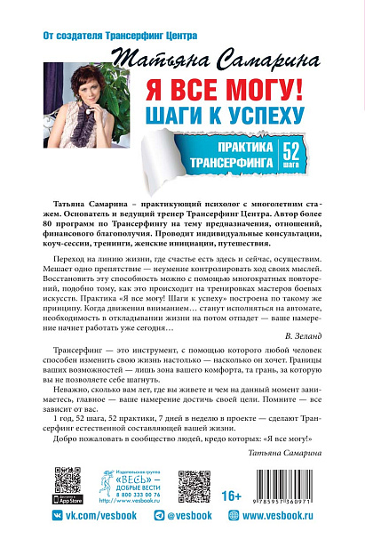 Трансерфинг - одно из самых популярных учений двух последних десятилетий, инструмент, который действительно работает. Татьяна Самарина преподает Трансерфинг с 2006 года, тысячи ее учеников смогли коренным образом изменить свою жизнь и достичь высот, о которых прежде даже не мечтали. Теперь на страницах этой книги Татьяна готова поделиться своими знаниями и опытом с вами.