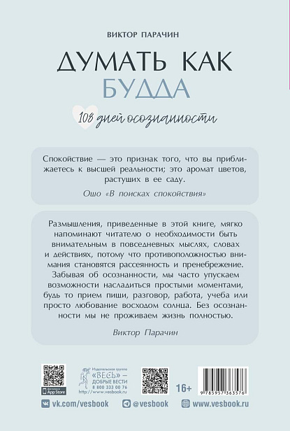 Виктор Парачин считает, что именно такое число -- 108 медитаций – позволят вам глубже проникнуться духом буддизма. Автор предлагает практические советы и упражнения для того, чтобы привнести осознанность в повседневную жизнь. Издание поможет читателю научиться управлять своими эмоциями, преодолевать внутренние конфликты и развивать спокойствие ума. Это руководство для тех, кто хочет практиковать осознанность и стремится к гармонии и внутреннему равновесию.