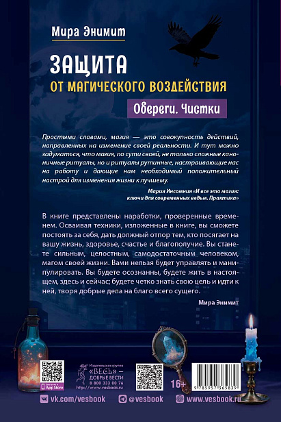 Книга Миры Энимит посвящена методам защиты от черной магии и негативных воздействий. Автор раскрывает природу черной магии, знакомит читателя с признаками магических атак и обучает методам противодействия. Основное внимание уделено способам энергетической защиты, очищения и восстановлению после магических нападений. Читатели смогут освоить практические приемы энергетических чисток, создать обереги для дома и усилить свое биополе.