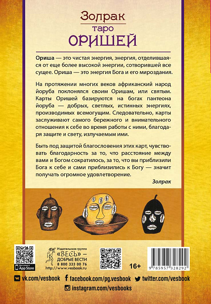 «Таро Оришей» — это уникальная колода карт, отражающая магическое мышление, мистерии и мифы африканского народа йоруба. Понятие «Ориши» означает «сверхъестественное», «нечто возвышенное», «священное», «могущественное», «выходящее за рамки земного мира». Другими словами, Ориши — это святые.