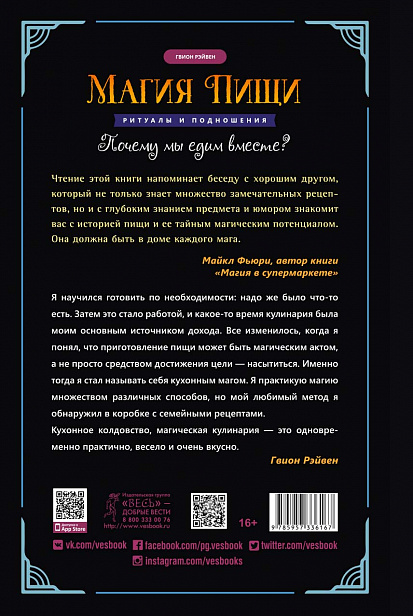 Книга мага и повара Гвиона Рэйвена познакомит вас с историей магических ритуалов приготовления и принятия пищи — от самой древней — шумерской — цивилизации до наших дней. Вы узнаете, когда появились и какую роль сыграли в развитии общества трехразовое питание, вегетарианство, званые обеды, уличная еда и повара-звезды.