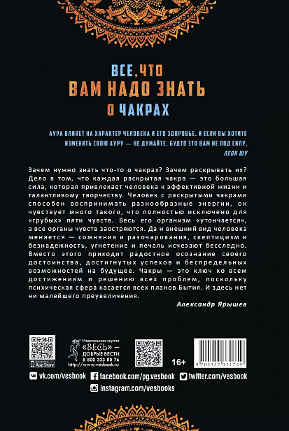 Когда редактор издательства «Весь» прочитал рукопись «Все, что вам надо знать о чакрах», он сразу принял решение об издании — так как более простого, понятого и доступного любому человеку руководства о чакрах не найти. Колектив издательства «Весь» уверен, что эту книгу ждет успех и что после ее прочтения читатели смогут самостоятельно работать со своими чакрами, чтобы улучить свое физическое здоровье, наладить отношения с другими, избавиться от наболевших проблем и, наконец, повысить качество собственной жизни.