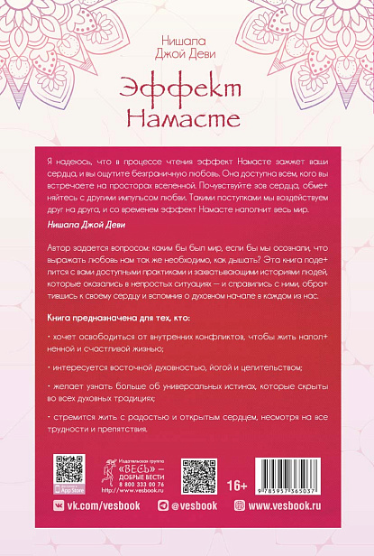 «Я надеюсь, что в процессе чтения Эффект Намасте зажжет ваши сердца, и вы ощутите безграничную любовь. Она доступна всем, кого вы встречаете на просторах вселенной. Почувствуйте зов сердца, обменяйтесь с другими импульсом любви. Такими поступками мы воздействуем друг на друга, и со временем эффект Намасте наполнит весь мир».