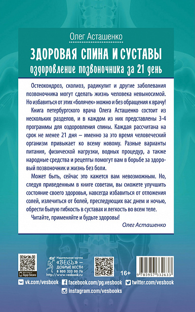 В книге петербургского врача Олега Асташенко представлены комплексные программы по лечению и профилактике таких заболеваний, как остеохондроз, сколиоз, радикулит, люмбаго. В них входят лечебная дыхательная гимнастика, йога, самомассаж, специальные системы питания, лечебные ванны, настои и отвары. Все они доказали свою эффективность и рекомендуются к самостоятельному применению.