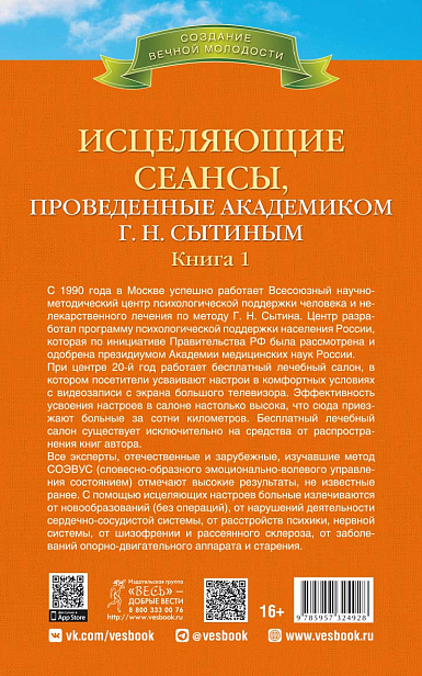 В Центре психологической поддержки, который возглавляет академик Сытин, три дня в неделю он проводит индивидуальные сеансы с конкретными больными, которые страдают самыми разными заболеваниями. Эти исцеляющие сеансы и легли в основу книги. Это высокоэффективные настрои, с помощью которых многим людям удалось исцелиться. Теперь они предлагаются для работы широкой публике, всем, кто хочет вылечиться от заболеваний нервной и сердечно-сосудистой систем, органов пищеварения и гинекологических заболеваний.