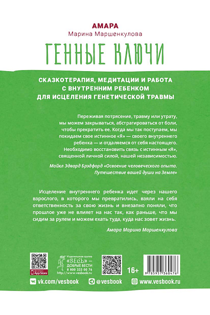 Амара Марина Маршенкулова предлагает читателям с помощью Генных Ключей и сказкотерапии проработать свои детские, а также поколенческие (генетические) травмы, чтобы исцелить душу в ее текущем воплощении и привнести в жизнь гармонию, цель и смысл.